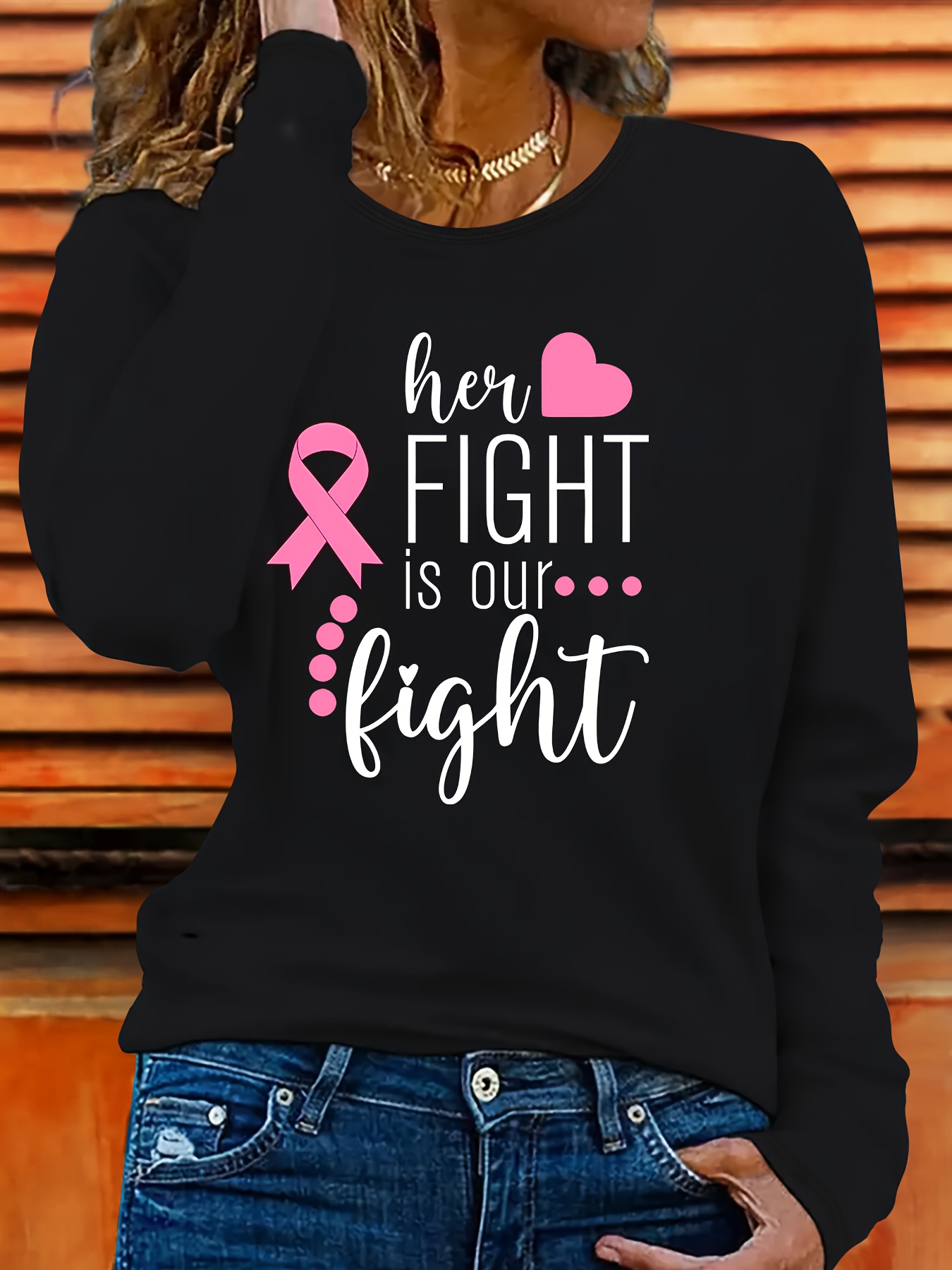 Her Fight is Our Fight Long Sleeve T-Shirt – Pink Ribbon & Heart Design, Relaxed Fit Casual Top, Soft Stretchy Fabric, Machine Washable, Supportive Apparel, Inspirational Text, Nontransparent Material